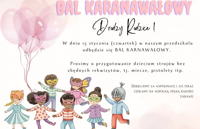 W dniu 15 stycznia (czwartek) w naszym przedszkolu odbędzie się BAL KARNAWAŁOWY.