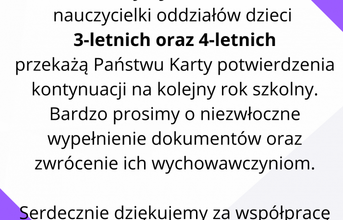 Szanowni Rodzice Uprzejmie informujemy, że od środy, tj. 28.01.2026 roku nauczycielki oddziałów dzieci 3-letnich oraz 4-letnich przekażą Państwu Karty potwierdzenia kontynuacji na kolejny rok szkolny. Bardzo prosimy o niezwłoczne wypełnienie...