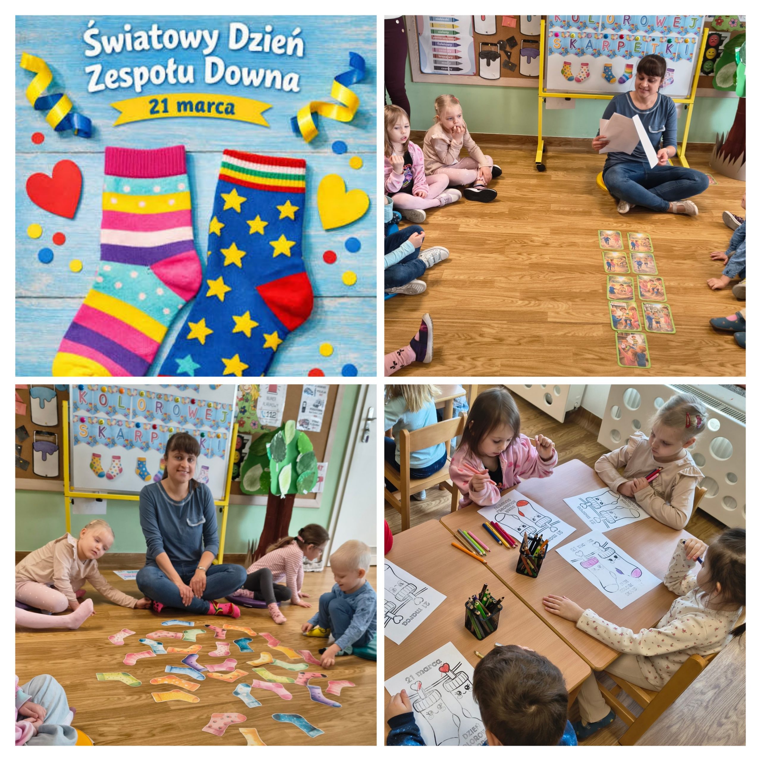 Dzieci z grupy Papużki włączyły się w obchody wyjątkowego Dnia Kolorowej Skarpetki czyli Światowego Dnia Zespołu Downa. Tego dnia dzieci pozakładały różnokolorowe skarpetki jako symbol solidarności z osobami z zespołem Downa, a także wyraz szacunku i akceptacji różnorodności. Na podstawie wysłuchanego opowiadania "Kolorowe skarpetki Janka" i wspólnej rozmowy dzieci zrozumiały symbolikę i znaczenie kolorowych skarpetek oraz to, że pomimo różnic każdy z nas jest tak samo ważny.