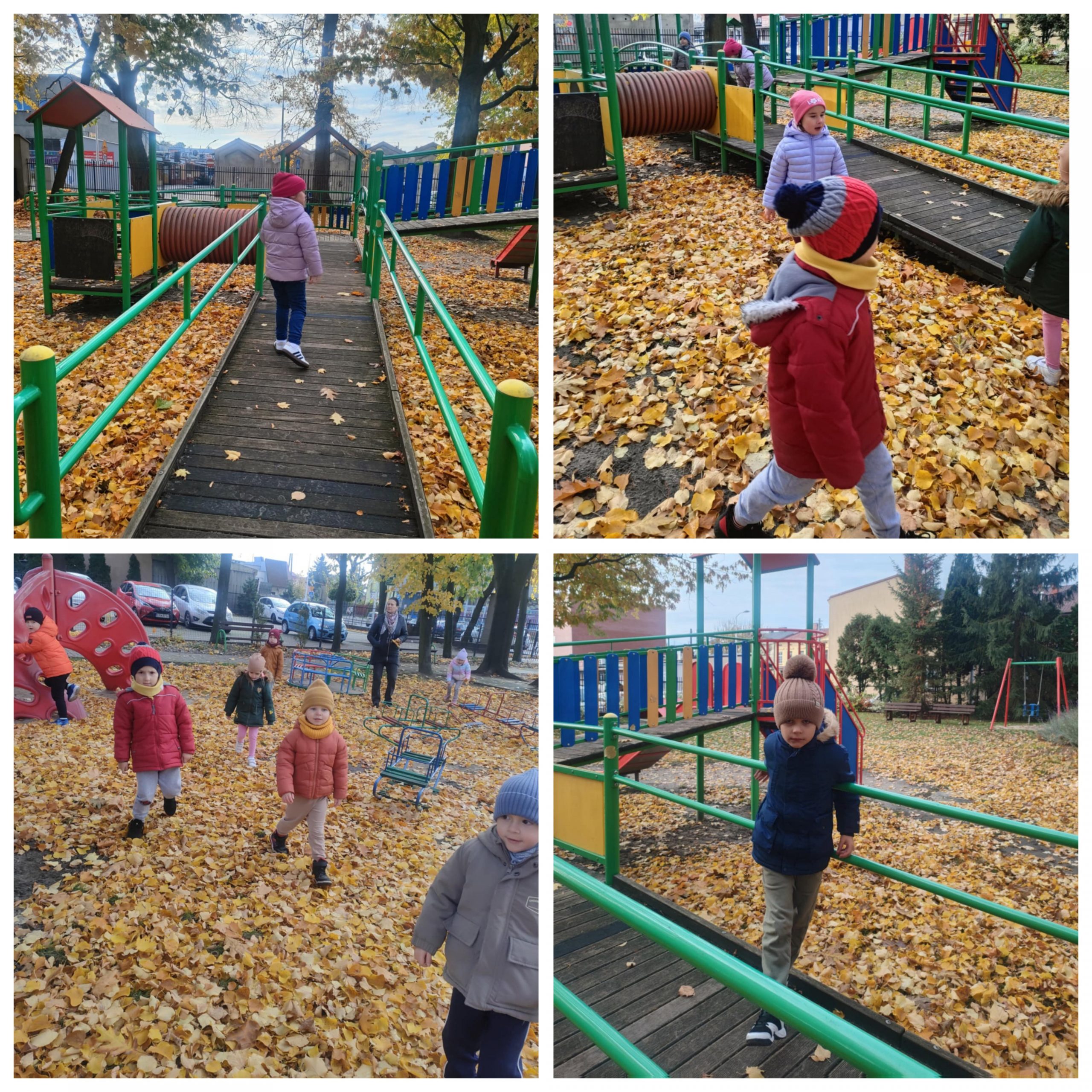 Na placu zabaw zrobiło się kolorowo – czerwone, żółte i brązowe liście to najlepsze zabawki!