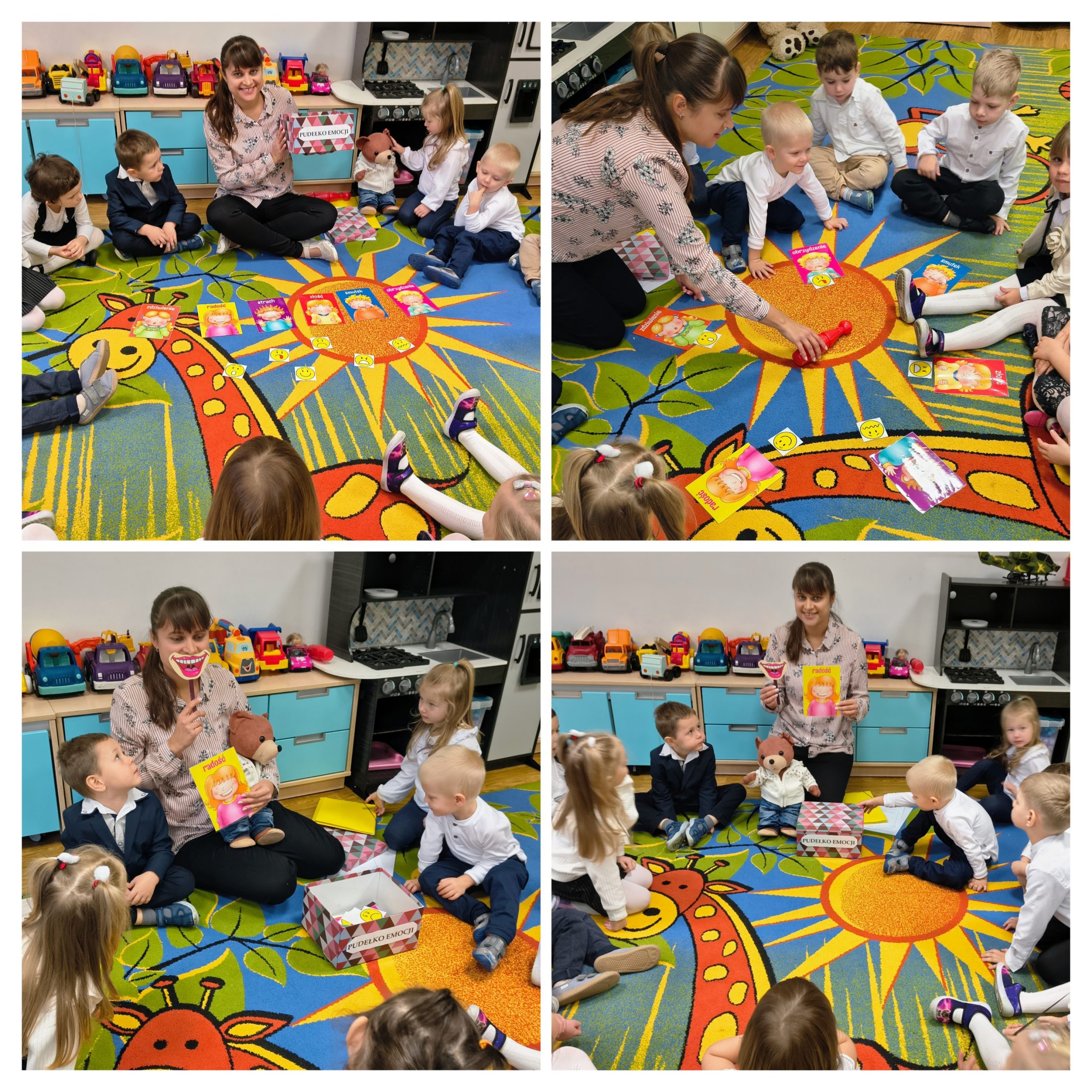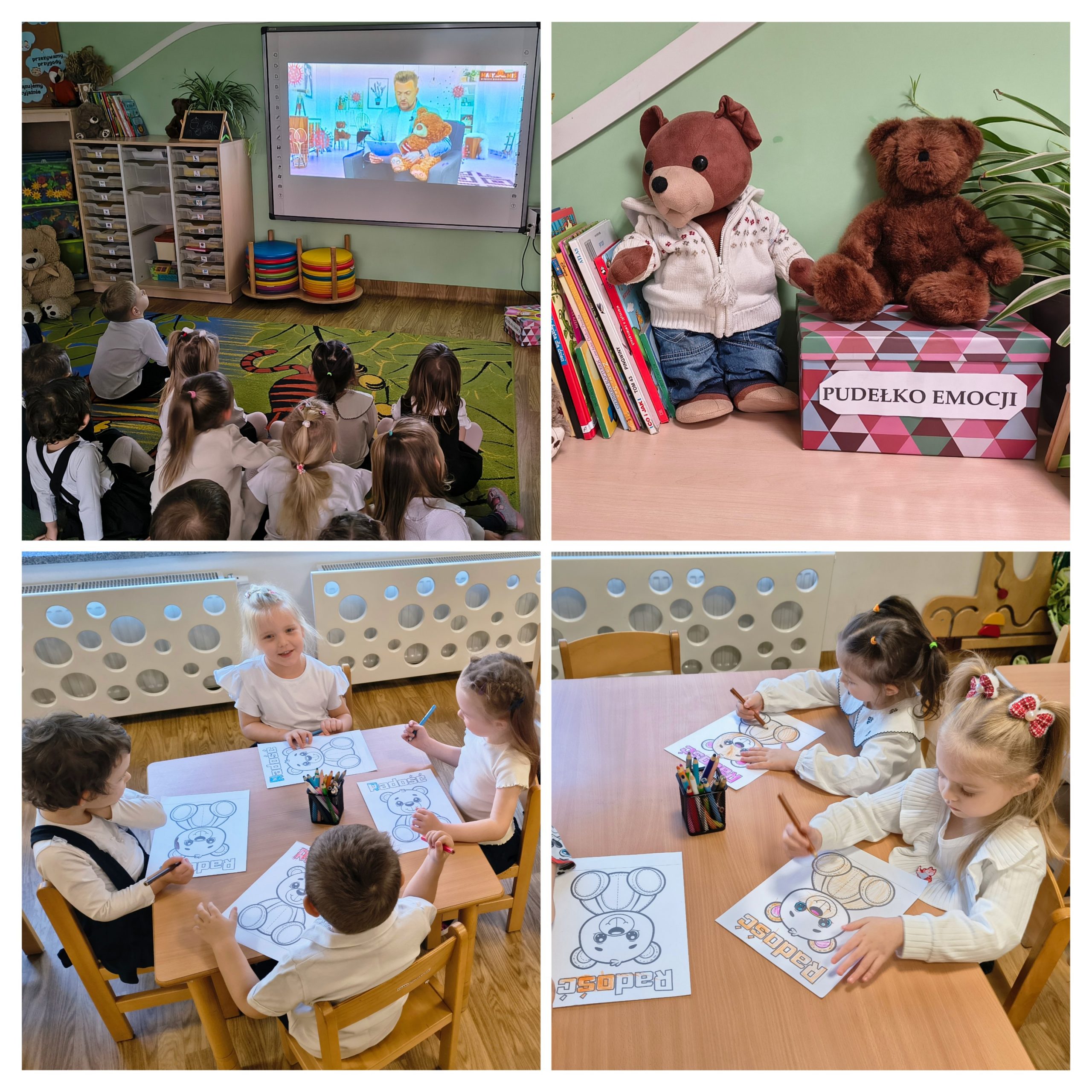 Rozpoczęliśmy realizację II modułu z projektu: "Mały Miś w świecie emocji". Wspólnie z Misiem Bruno stworzyliśmy "pudełko emocji" i rozpoznawaliśmy na obrazkach emocje, dzieci uczyły się w jaki sposób okazywać i radzić sobie z różnymi emocjami. Wysłuchaliśmy opowiadania autorstwa Anety Konefał pt. "Radość" i rozmawialiśmy o jego treści i o tym, czym jest radość. Były zabawy tematyczne, a na koniec dzieci pokolorowały sylwetę radosnego Małego Misia. Razem z Małym Misiem będziemy kontynuować podróż do krainy emocji.