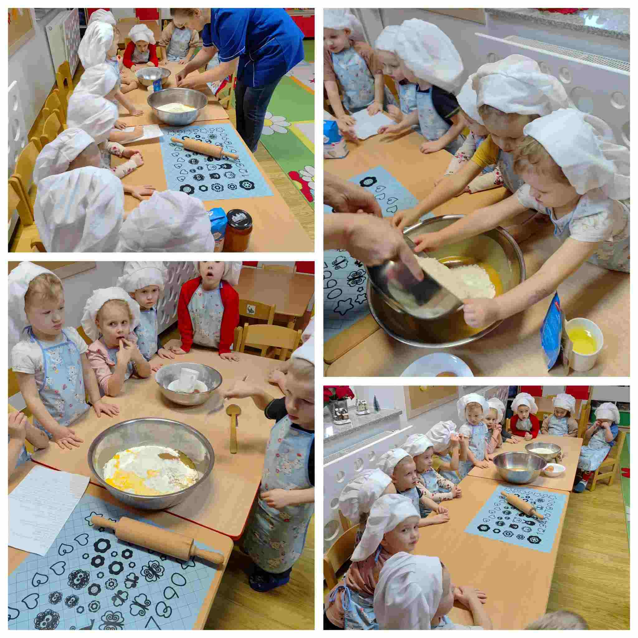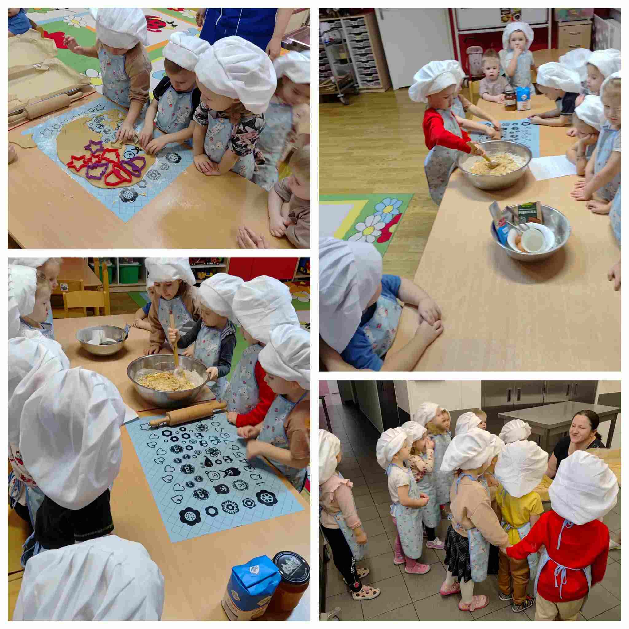 Przedszkolaki z radością uczestniczyły w zajęciach kulinarnych, podczas których robiły pierniki. Dzieci wałkowały ciasto, wykrawały świąteczne kształty i z dużym zaangażowaniem przygotowywały pachnące, świąteczne wypieki.