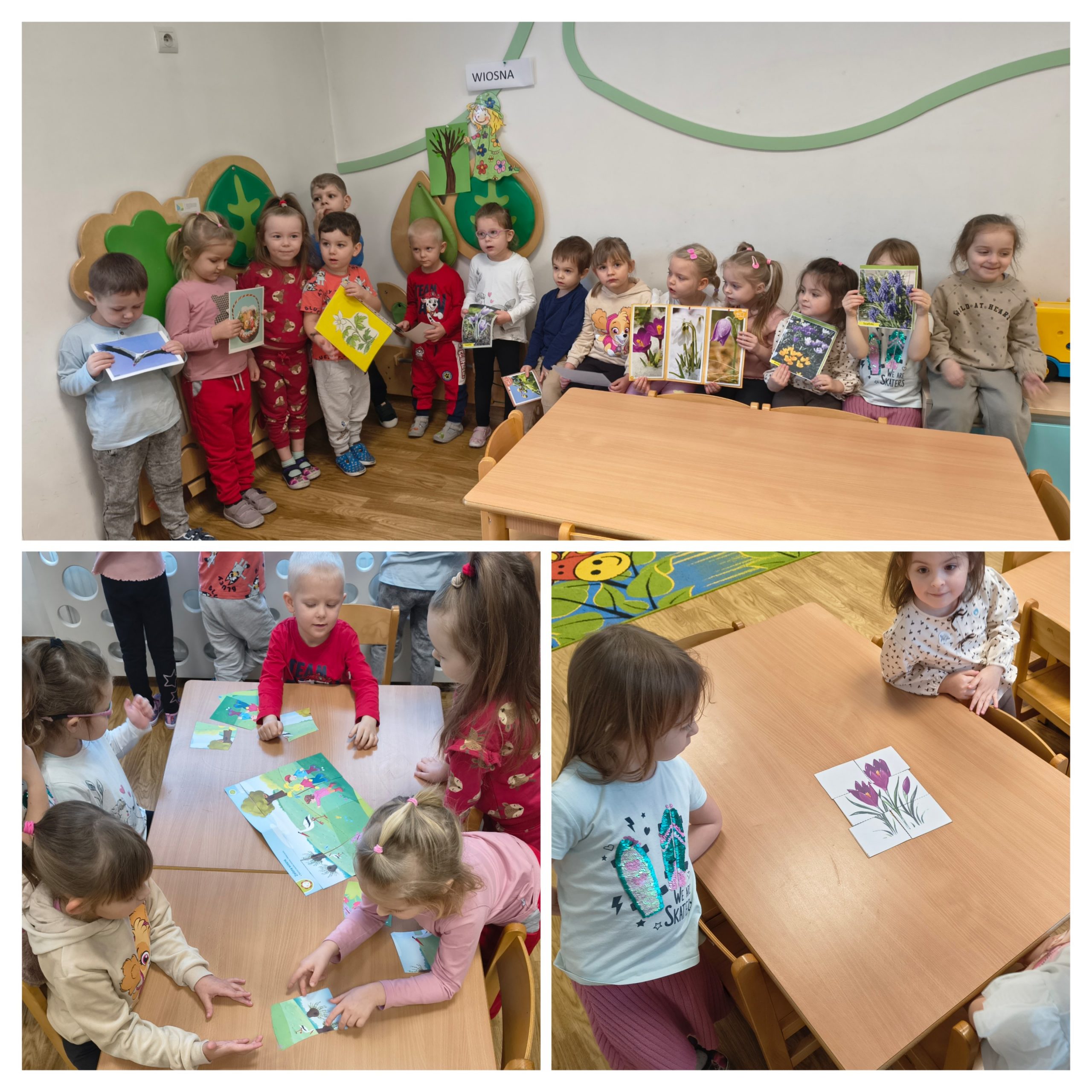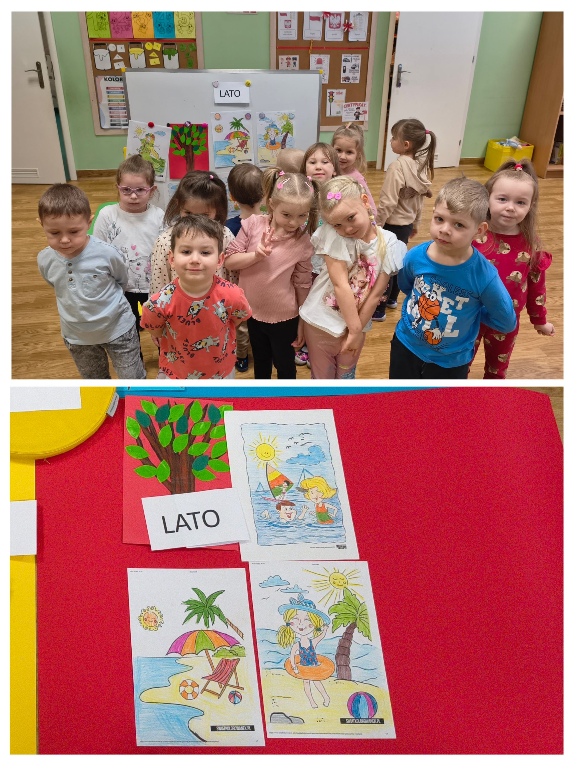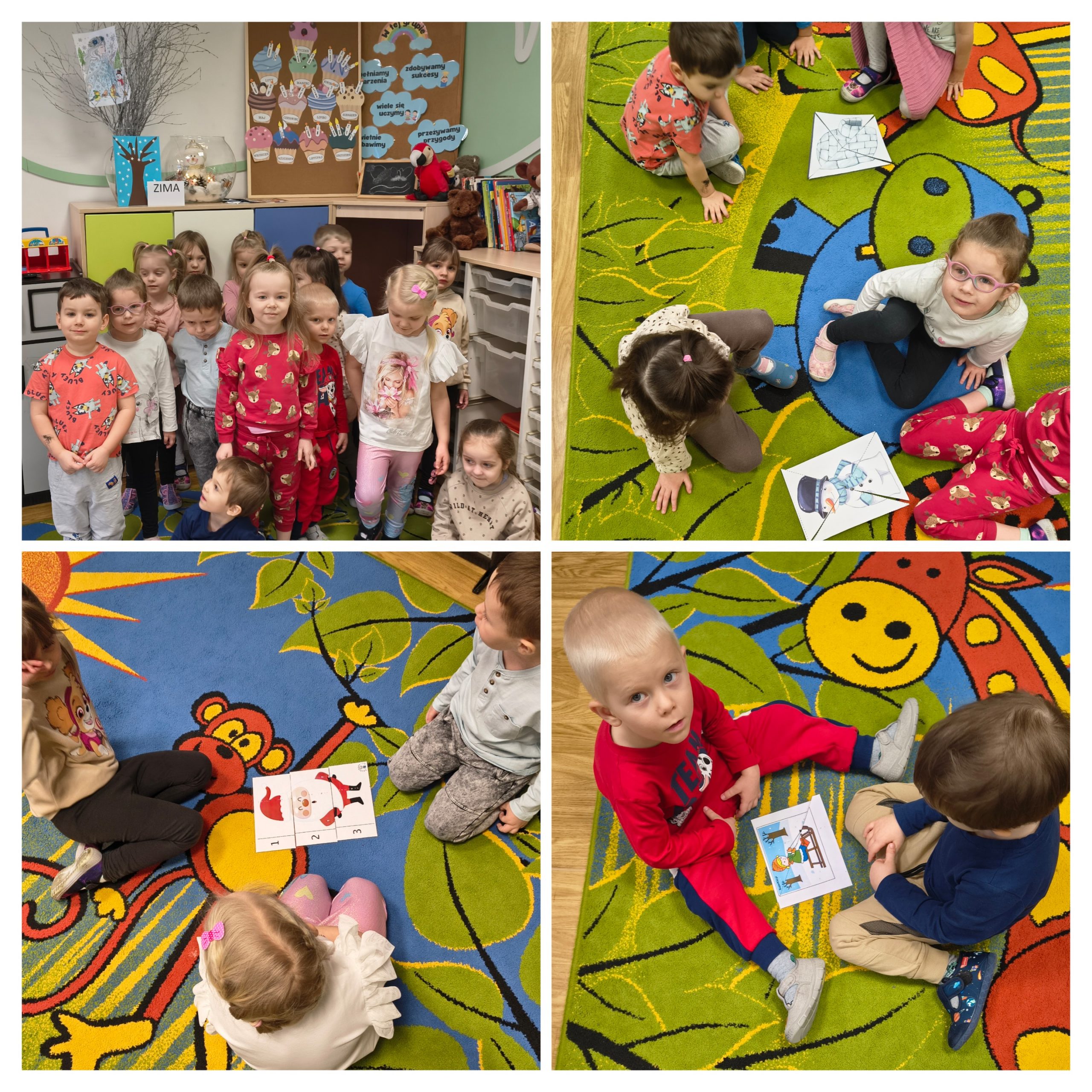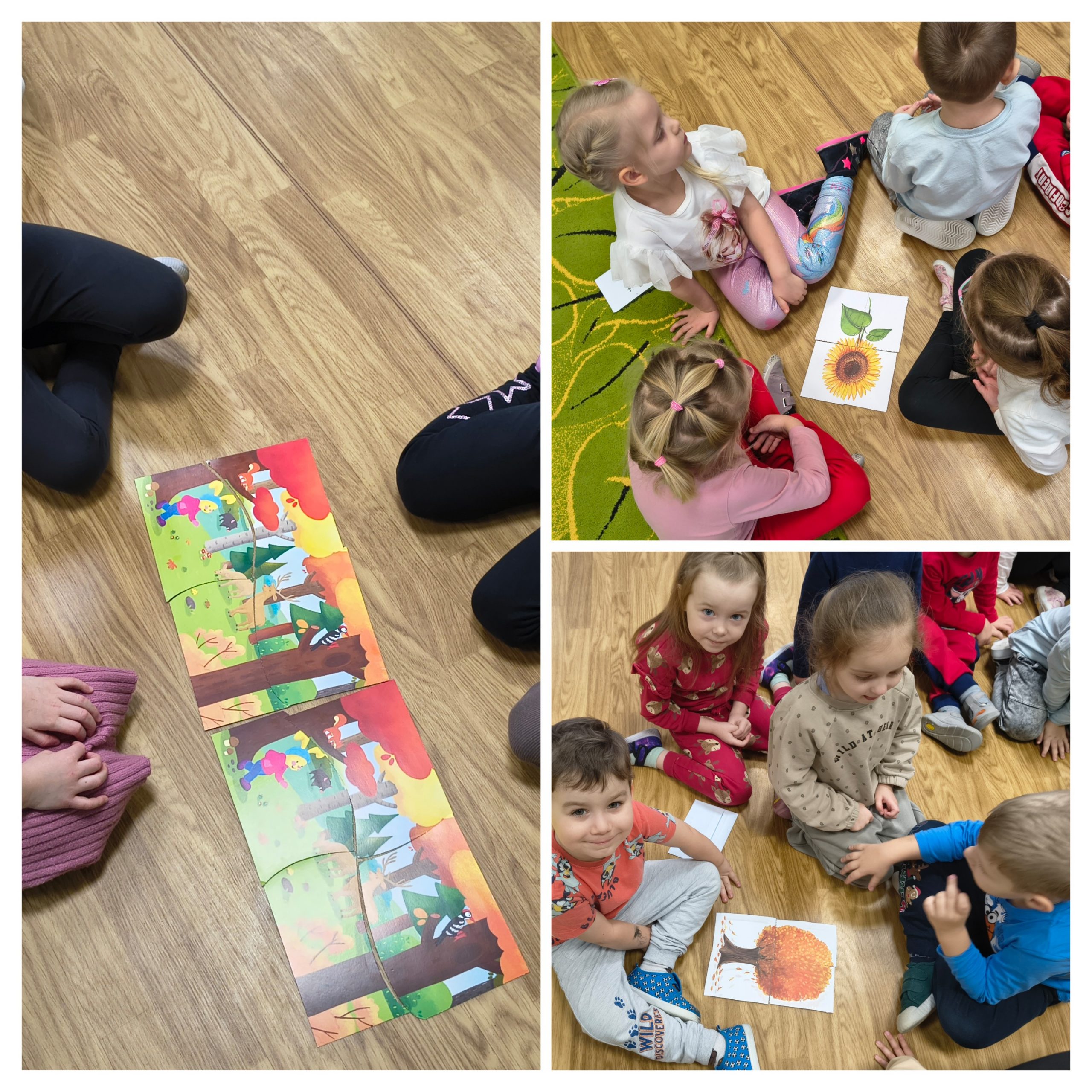 Na dzisiejszych zajęciach rozmawialiśmy o porach roku, a także podróżowaliśmy pociągiem, który zatrzymywał się kolejno na stacjach: wiosna, lato, jesień, zima. Dzieci układały puzzle związane z porami roku, następnie przyporządkowywały odpowiednio obrazki pasujące do danej pory roku i koloru. Wszyscy świetnie się bawiliśmy, a dzieci utrwaliły jakie są znaki szczególne pór roku.