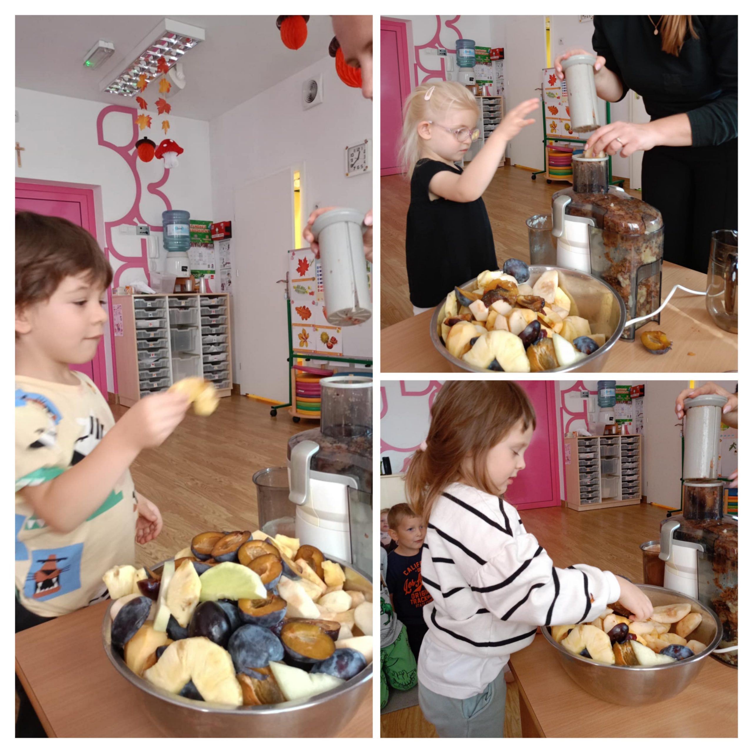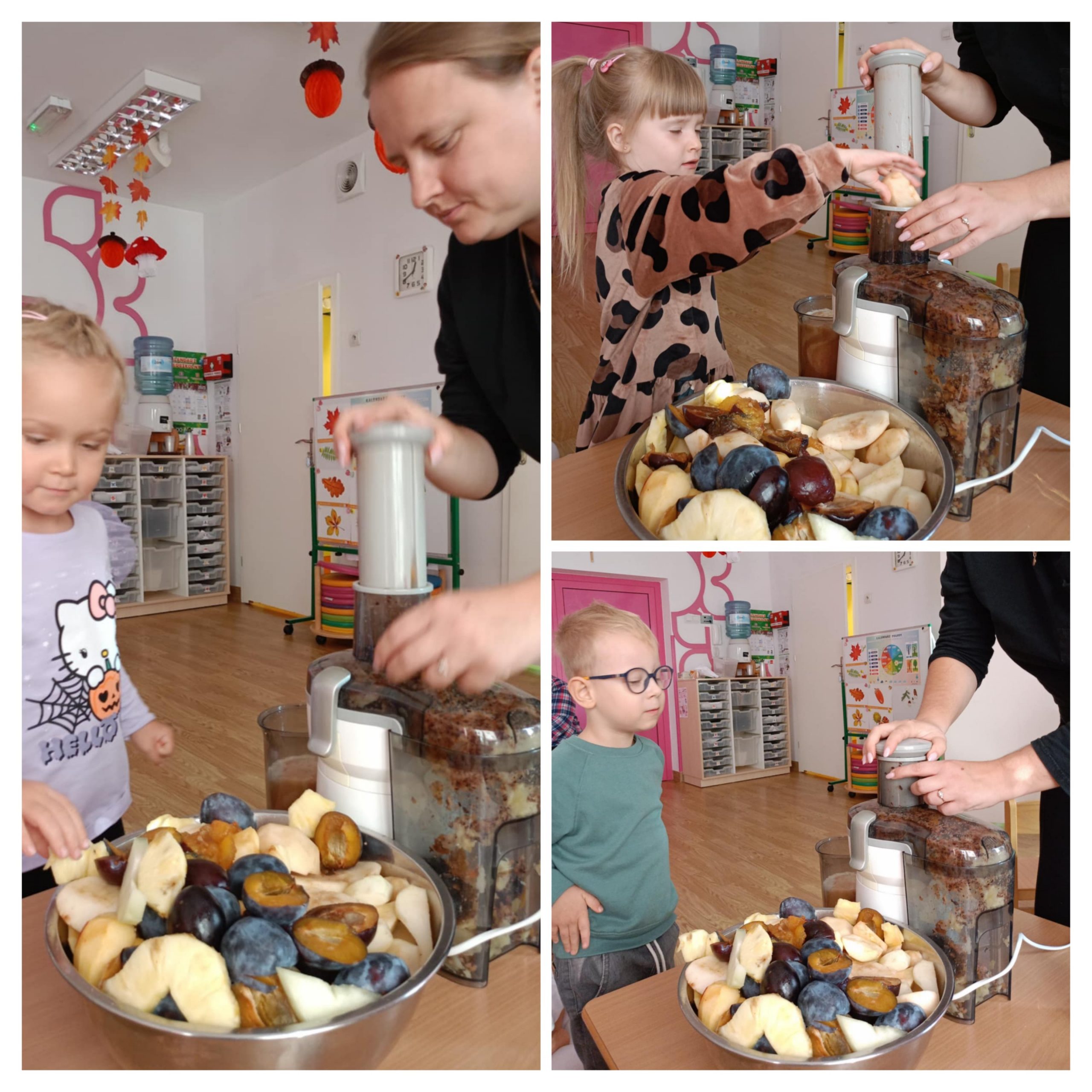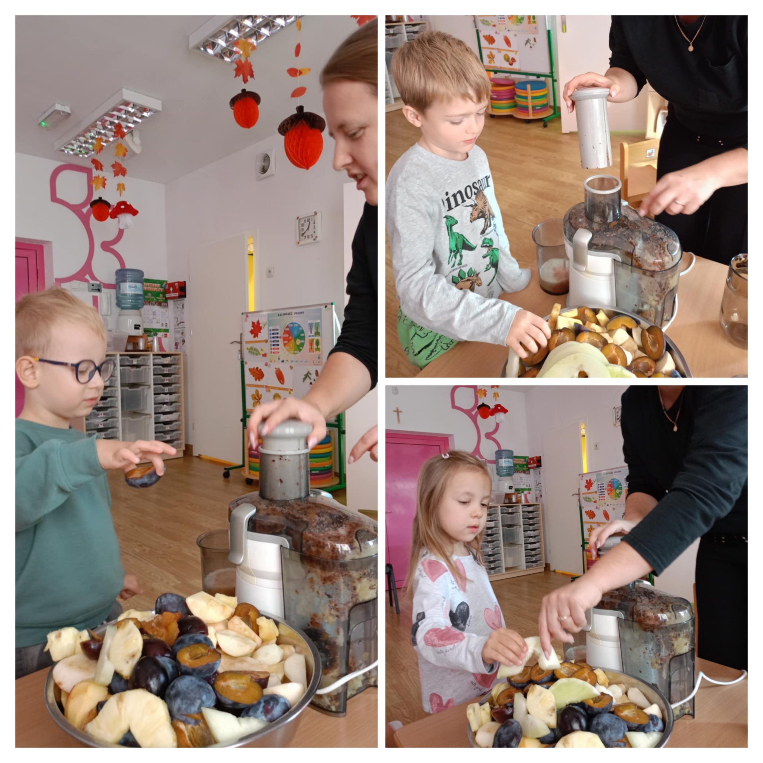 Dziś "Motylki" zamieniły się w prawdziwych małych kucharzy! Podczas zajęć dzieci miały okazję przygotować własny, zdrowy sok owocowy ze świeżych, kolorowych owoców. Na stole królowały soczyste jabłka, gruszki, śliwki , a nawet ananas. Przedszkolaki dowiedziały się dlaczego warto jeść owoce i jak ważne są zdrowe nawyki żywieniowe. Na koniec każdy z dumą wypił swój własnoręcznie zrobiony sok - a uśmiechy dzieci były najlepszym dowodem na to, że zdrowe może być pyszne!