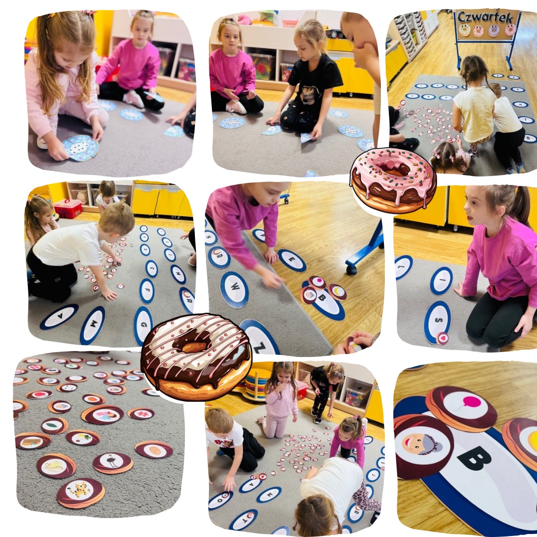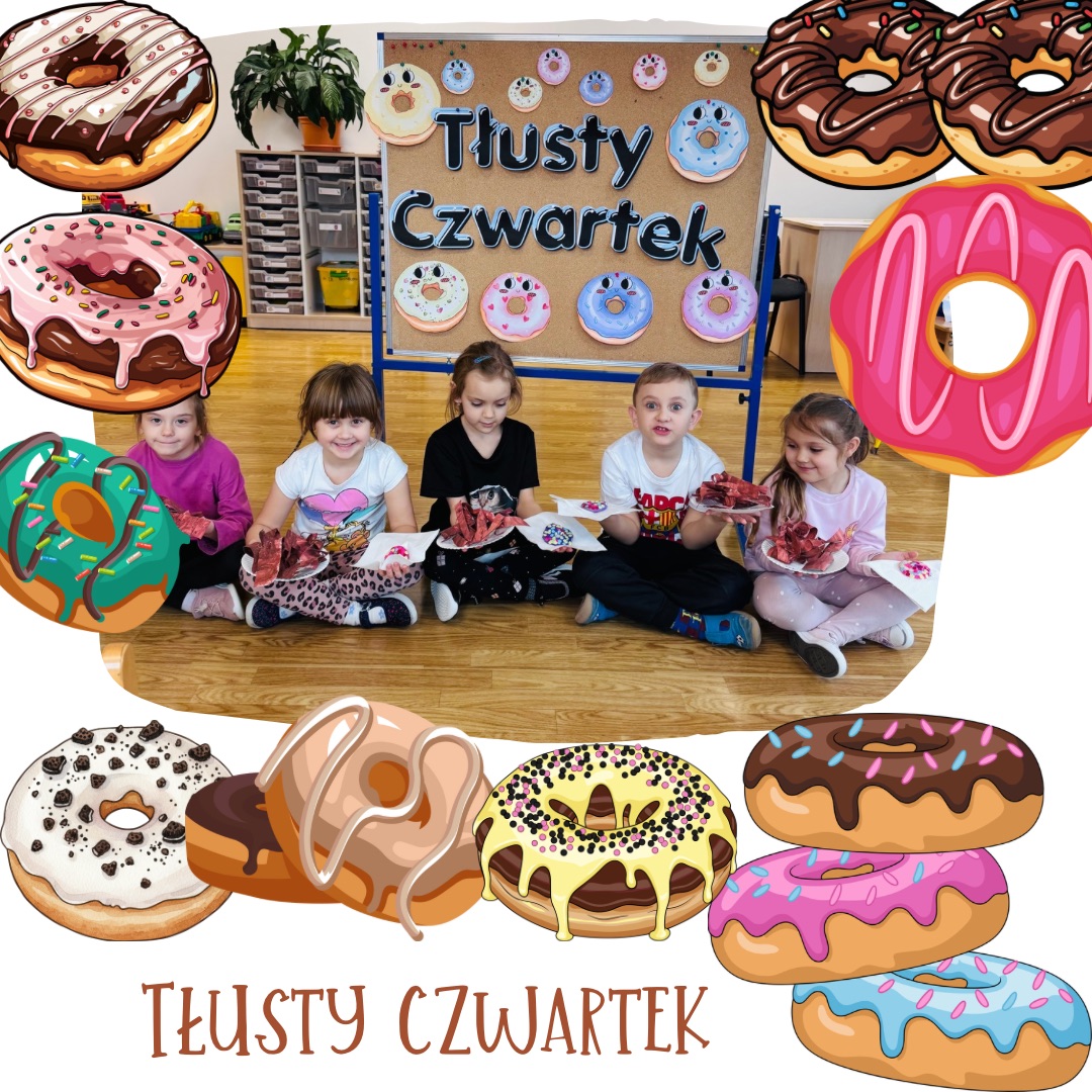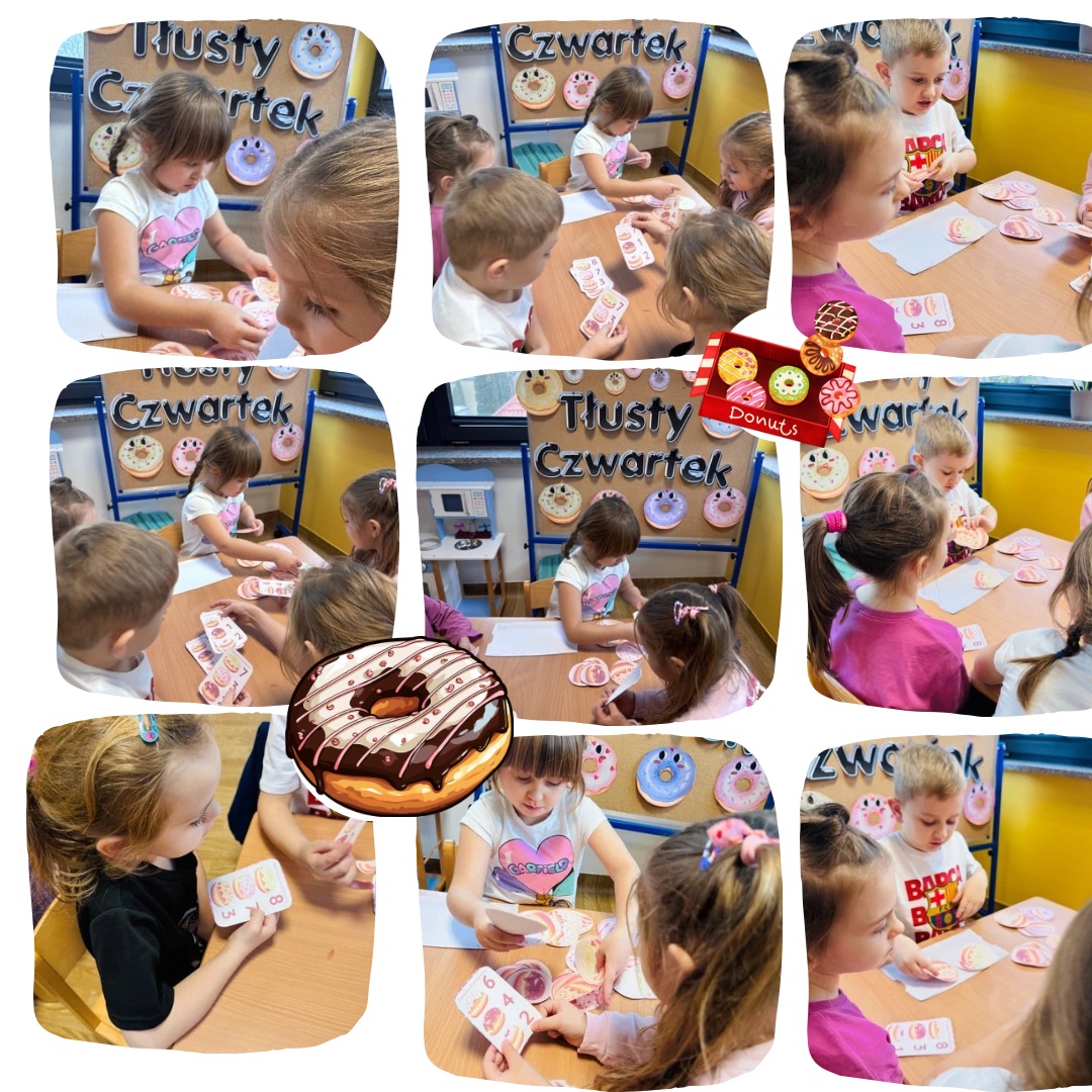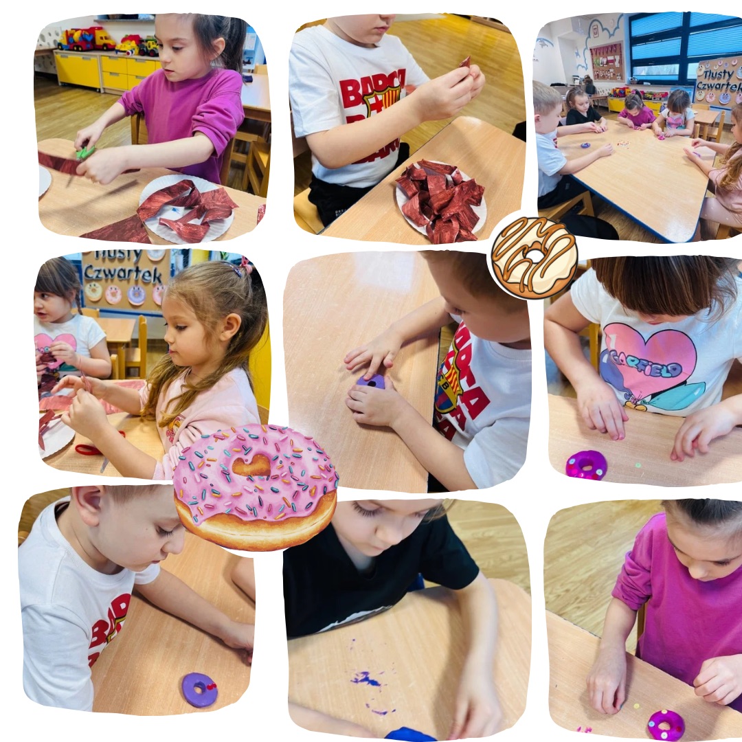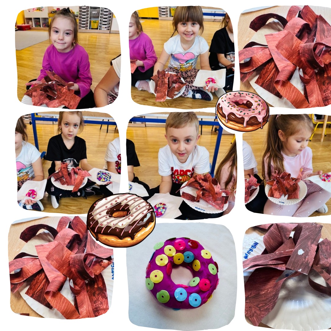 Podczas zajęć dzieci zamieniły się w małych cukierników. W naszej „Cukierni Pana Pączka” układaliśmy słodkości według głoski, którą słyszeliśmy na początku wyrazu, a także pakowaliśmy zamówienia zgodnie z podaną instrukcją, ćwicząc uważne słuchanie i analizę słuchową. Na zakończenie powstały piękne, kolorowe prace plastyczne – faworki oraz pączki, a także własnoręcznie ulepione z plasteliny słodkości. To był dzień pełen radości, kreatywności i nauki przez zabawę!